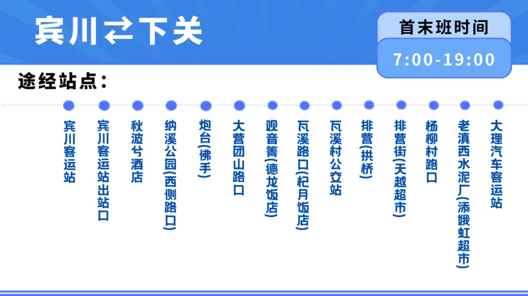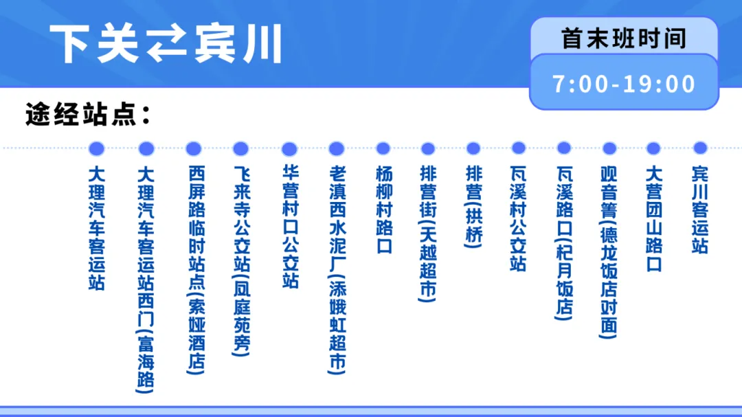 賓川→下關(guān)乘車(chē)站點(diǎn):賓川客運(yùn)站、賓川客運(yùn)站出站口、秋波兮酒店、納溪公園(西側(cè)路口)、炮臺(tái)(佛手)、大營(yíng)團(tuán)山路口、觀(guān)音箐(德龍飯店)、瓦溪路口(杞月飯店)、瓦溪村公交站、排營(yíng)(拱橋)、排營(yíng)街(天越超市)、楊柳村路口、老滇西水泥廠(chǎng)(添娥虹超市)、大理汽車(chē)客運(yùn)站14個(gè)乘車(chē)站點(diǎn)。